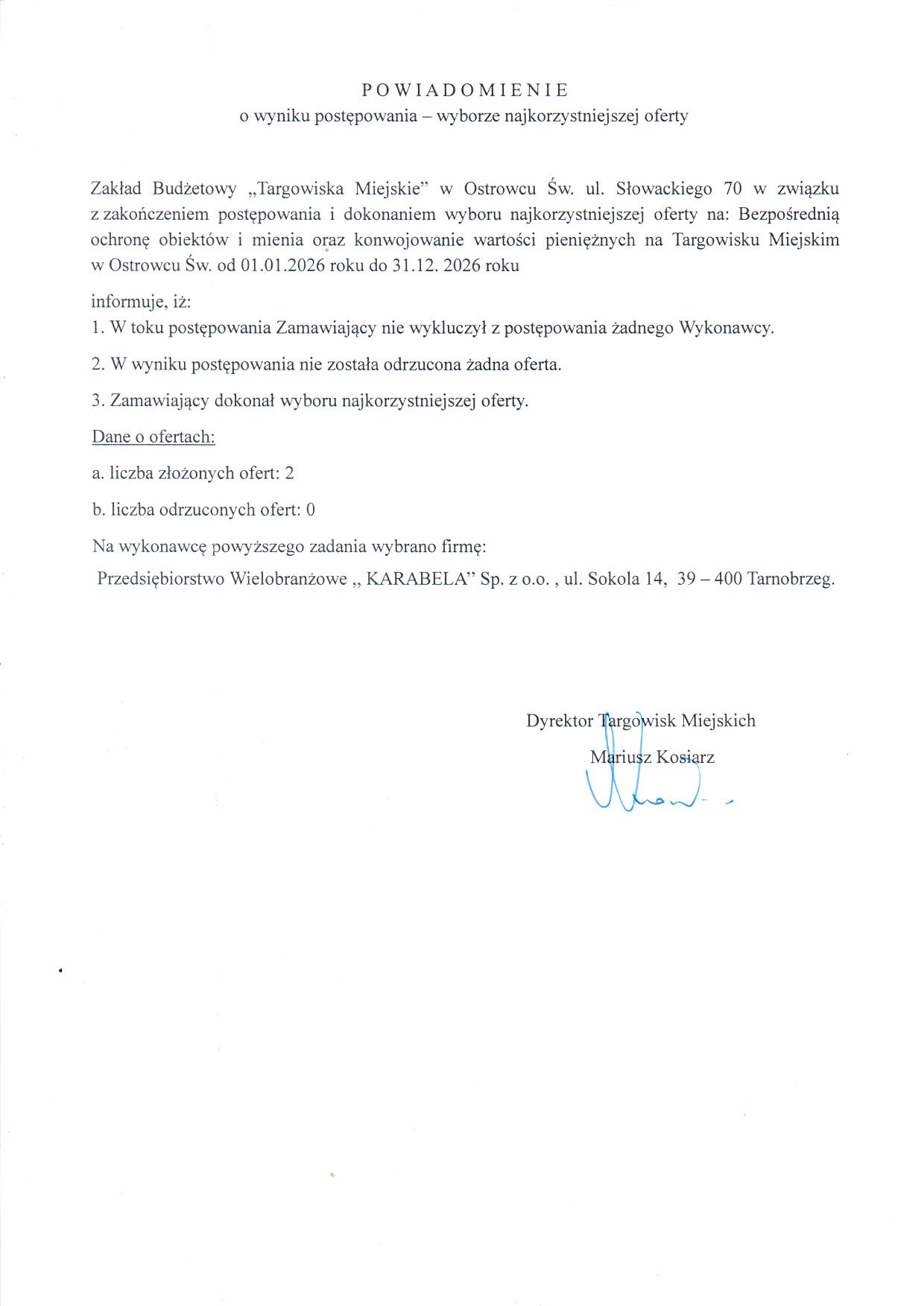 - Powiadomienie o wyniku przetargu na usługę ochrony Targowisk Miejskich na 2026 rok