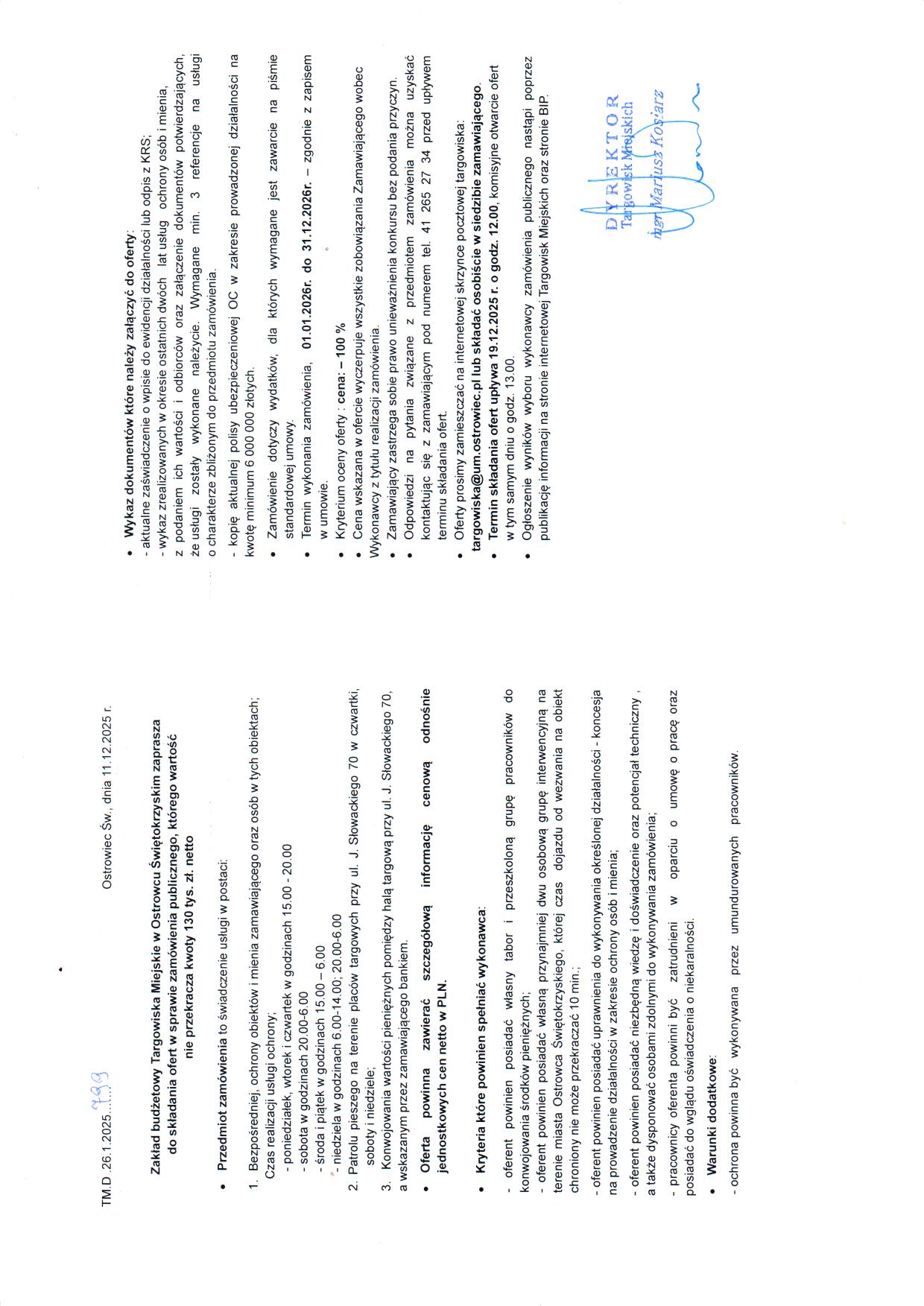- Przetarg na usługę ochrony Targowisk Miejskich na 2026 rok.